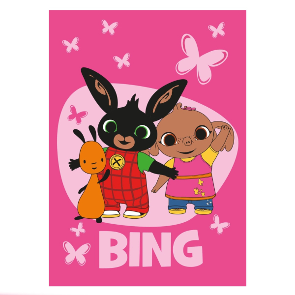Hebká a hřejivá dětská deka s motivem Králíčka Binga, Flopa a Suly je ideální pro každodenní použití. Růžové pozadí s motýlky a výrazným nápisem "BING" potěší každého malého fanouška této oblíbené pohádky. Rozměr 100×150 cm je perfektní na přikrytí, hraní i odpočinek.